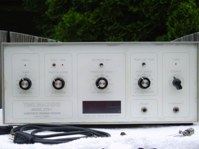 Below is a picture of the original “time machine.” If one looks close one can see dials for adjusting tempo, the reference beat, the pitch for the “right-on” feedback tone, loudness of tones & the reference beat, and monitoring the number of responses right in a row. These technological elements are still present in today’s sleek and small IM units. Although miniaturization has reduced the size of the original “time machine”, the basic ingredients of the IM technology were present in this original unit (circa early 1990’s).